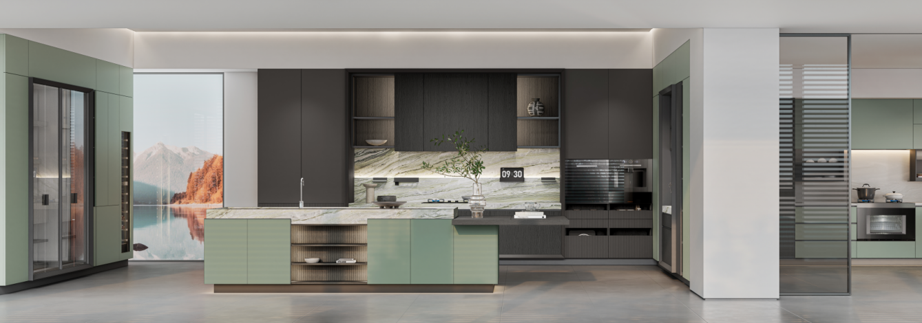 例如,在“洞庭”系列的厨房空间,实现了空间极简与功能极繁的平衡。在湖光盛境中,热气腾腾的烟火里,厨房油烟机嵌入顶柜、冰箱融于墙面,搭配创新石墨烯双面保温抽和透明升降屏,既确保了视觉语言的统一、功能逻辑的高效,又能令操作体验无感且流畅。